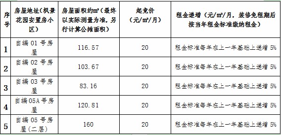 一、竞拍人(含个人及企业,下同)应按主拍人提出的加价幅度进行竞拍,竞拍价按每月每平方米报价,竞拍成功后按租期第五年季度租金金额缴纳合同履约保证金。中标人一周内签订合同,履约保证金及预缴首年一个季度租金与季度物业费在签订合同之日内一次性交清,否则做废标处理。枫景安置房小区房屋租赁竞拍规则