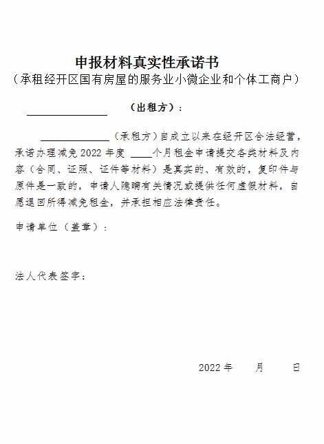 申报承租的服务业小微企业和个体工商户向出租经营用房的国有企业(租赁合同的出租方)提出书面申请,根据洪府发【2022】15号文件精神,由金开星空体育在线官网首页_星空体育(中国)按照市、区相关减免政策减免承租国有房屋租赁租金进行审核,对符合条件的承租户给予减免。鼓励对老承租户实行“免申即享”新模式,通过梳理减租资产和承租户清单,对于现有材料能够证明其符合减租政策的承租户,在履行相应决策程序后,直接予以减免。