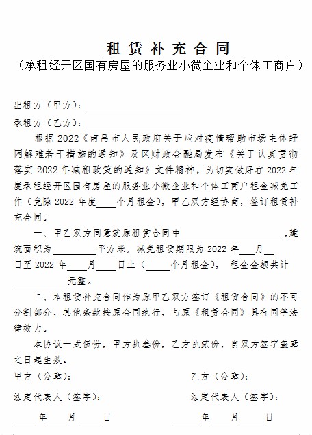 为认真贯彻《南昌市人民政府关于应对疫情帮助市场主体纾困解难若干措施的通知》(洪府发【2022】15号)文件精神,根据区财政金融局发布《关于认真贯彻落实2022年减租政策的通知》,结合经开区实际,落实承租经开区域内国有房屋的服务业小微企业和个体工商户,2022年减免三个月租金,确保减免租金惠及最终承租人。现将实施细则通知如下: