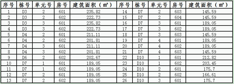 26 | 商业2-2#-1-203 | 57.25 | 66 | 商业2-5#-1- 0112 | 50.54 | 106 | 商业2-7#-1- 0110 | 255.17 |