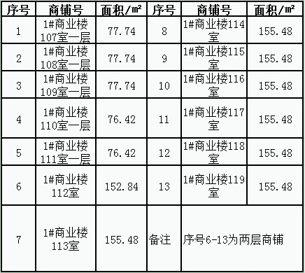 序号 | 商铺号 | 面积/㎡ | 序号 | 商铺号 | 面积/㎡ | 序号 | 商铺号 | 面积/㎡ |