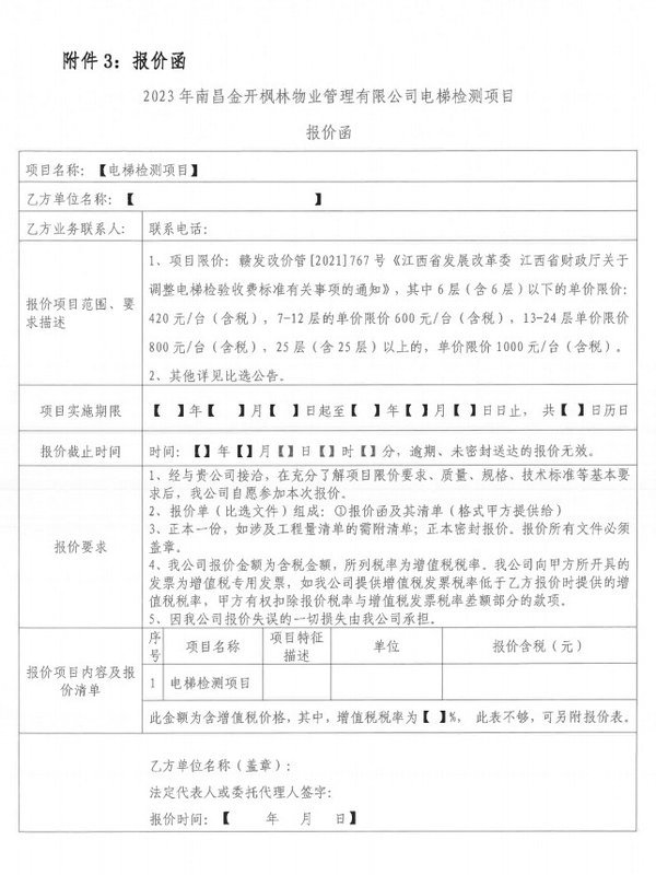 南昌金开枫林物业管理有限公司现对经开区管辖的各项目点电梯检测项目进行公开比选,比选内容具体要求如下: