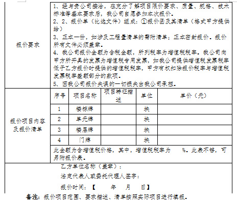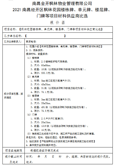 枫林花园楼栋牌、单元牌、楼层牌、门牌等项目材料供应商比选
