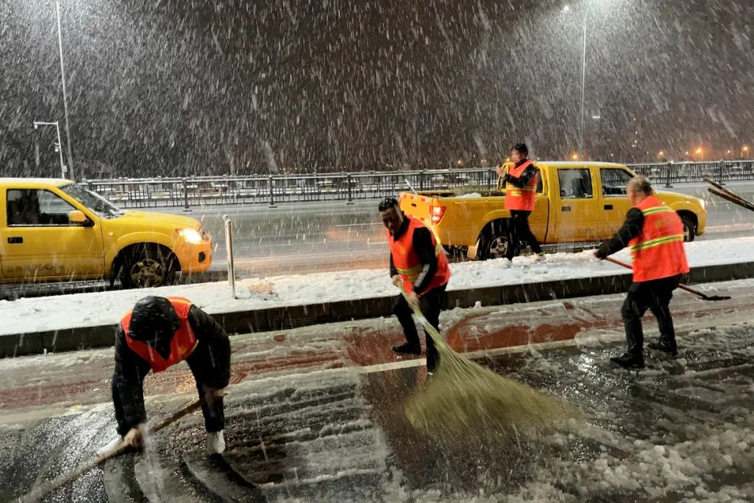 公司领导一线协调指导,沿线查看除雪作业现场,传授自己的经验方法,协调各方处置应对。全员顶严寒一线除雪破冰,撒盐铲雪,日夜坚守,保障来往车辆安全通行。