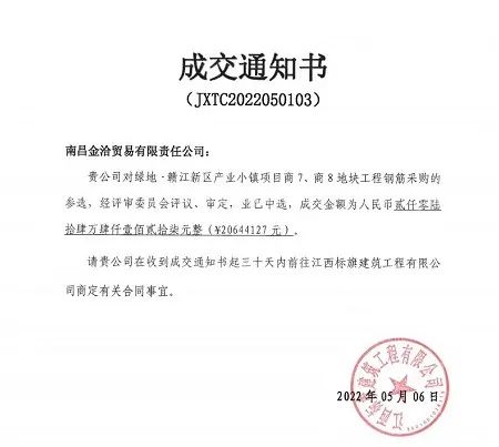 ➤江西标旗建筑工程有限公司绿地赣江新区产业小镇商7、商8地块工程钢筋采购项目,合同金额约2000万元。