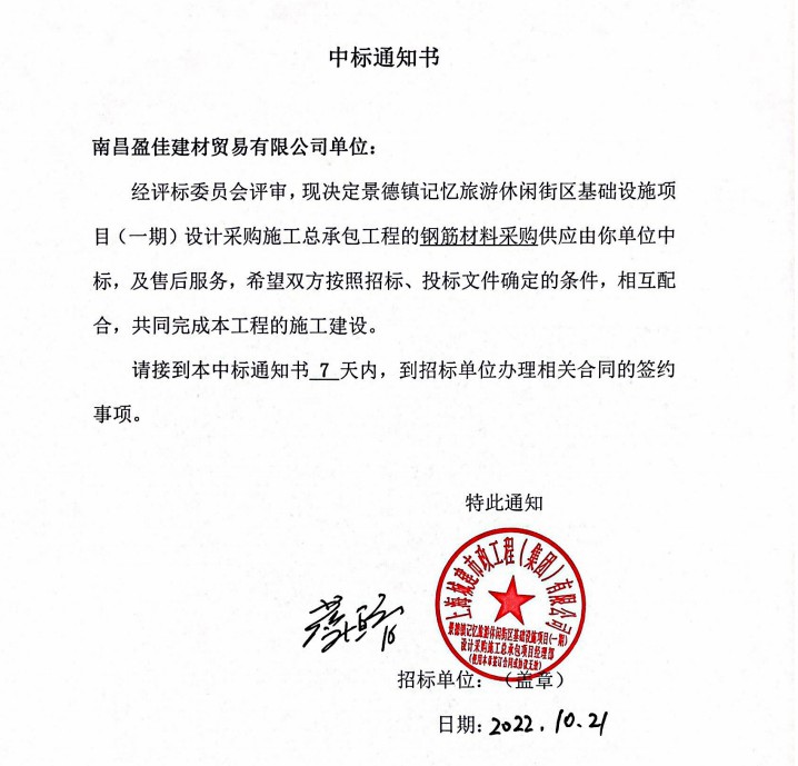 10月21日,南昌盈佳建材贸易有限公司成功中标上海城建市政工程(星空体育在线官网首页_星空体育(中国))有限公司景德镇记忆旅游休闲街区基础设施项目(一期)钢筋项目(约2300吨钢筋,中标金额约980万元)。