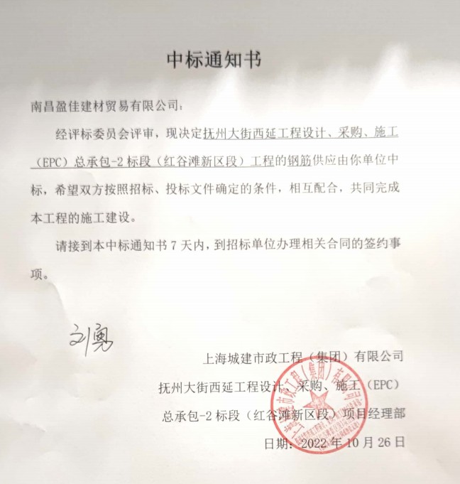 10月26日,南昌盈佳建材贸易有限公司成功中标上海城建市政工程(星空体育在线官网首页_星空体育(中国))有限公司抚州大街西延工程设计、采购、施工(EPC)总承包-2标段(红谷滩新区段)工程钢筋项目(约2500吨钢筋,中标金额约1060万元)。