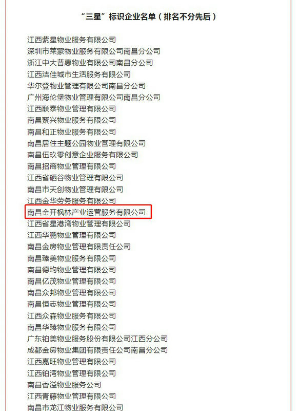 8月21日,南昌市住房和城乡建设局公布《2022年度南昌市物业服务企业信用信息评价结果》的通知。其中,枫林产业公司获得全市物业服务企业信用“三星”评级标识!