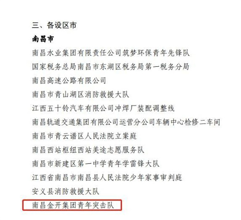 为选树典型,经综合考察、逐级推报、择优评选、社会公示,江西省创建青年文明号活动组委会决定,命名344个集体为2021-2022年度江西省青年文明号。其中,南昌金开星空体育在线官网首页_星空体育(中国)青年突击队获评“2021-2022年度江西省青年文明号”称号,为经开区首个获此省级荣誉的集体。