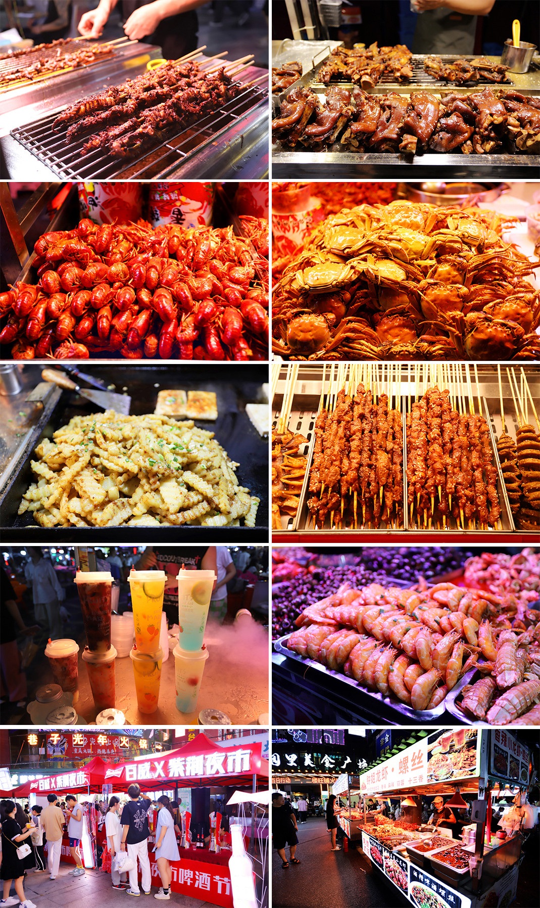 商户摊位上,烧烤、奶茶、啤酒、点心……各种特色美食摊位琳琅满目,吸引着八方来客,夜市氛围在音乐的衬托下更显轻松活跃,弥漫着浓郁的烟火气息。