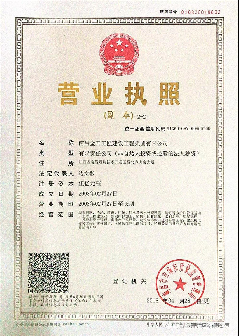 据悉,南昌金开工匠建设工程星空体育在线官网首页_星空体育(中国)有限公司注册资金伍亿元,旗下拥有五家子公司,且具有市政工程施工总承包二级,房建、土石方、城市及道路照明,园林绿化等多项资质。