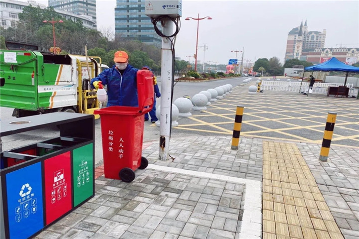 此外,多方购买消毒用品,加大辖区内防疫消杀频次,对重点区域及环卫设施设备每日进行4~5次消杀。