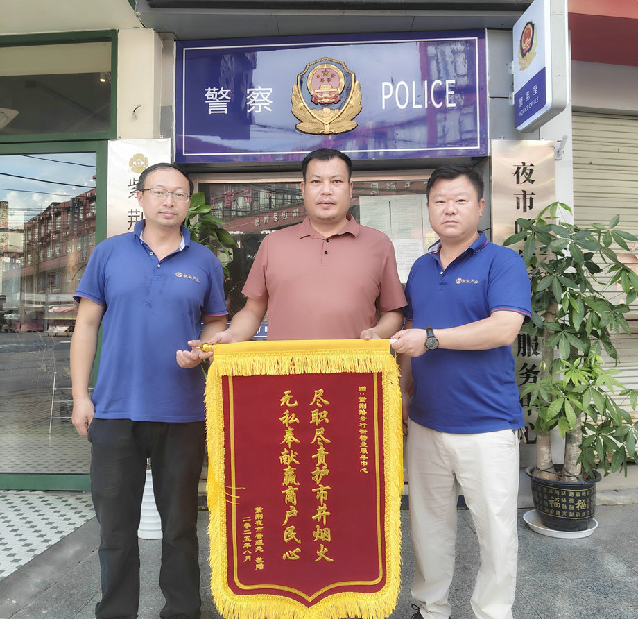 紫荆夜市管理方将一面绣着尽职尽责护市井烟火 无私奉献赢商户民心"的锦旗送到物业服务中心。据了解,紫荆夜市客流量多,管理难度大。物业团队坚持每日开展安全巡查,重点检查用电安全、消防设施和环境卫生。在夏季用电高峰期,还特别增加了巡查次数和巡查时长,确保及时处置各类突发情况。夜市管理方表示,正是枫林物业公司人员的全天候守护,才让这个城市"烟火气"得以安全绽放。